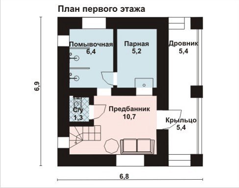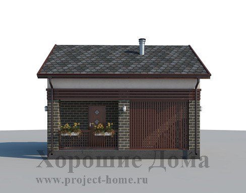 Любители и настоящие ценители хорошего пара по достоинству оценят этот проект отдельно стоящего здания бани, очень компактного и эргономичного, спланированного с учётом всех потребностей и желаний её почитателей. Небольшая закрытая терраса на входе в баню является местом для дров, которые в любое время года сохраняются сухими, и печь будет легко растапливаться.