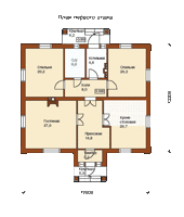 Вход в дом предваряет небольшое крытое крыльцо, и далее ведет через тамбур в просторную прихожую. Слева от нее расположена уютная гостиная комната, оборудованная камином. А справа – кухня-столовая площадью 20,7 кв. м. В доме предусмотрены две спальни, в которые можно попасть через небольшой холл. Обе спальни являются зеркальным отражением друг друга с одинаковой площадью – 20,2 кв. м.