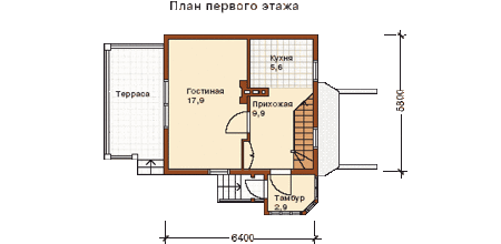 Вход в дом организован с высокого крыльца через небольшой остеклённый тамбур. В просторной прихожей, плавно переходящей в уютную кухню, имеются встроенные гардеробные шкафы, а в углу помещения разместилась открытая лестница, ведущая на мансардный этаж. Камин в небольшой по размерам гостиной придаёт пространству удивительный колорит настоящего деревенского дома.