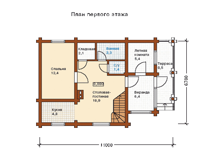 Главной комнатой коттеджа является столовая-гостиная, имеющая второй свет. В ней уютно размещен камин и широкая удобная лестница на второй этаж. Хозяева и гости особняка будут надежно защищены от сквозняков в холодное время года благодаря большой веранде, из которой можно попасть в небольшую летнюю комнату площадью 5,4 кв. м.