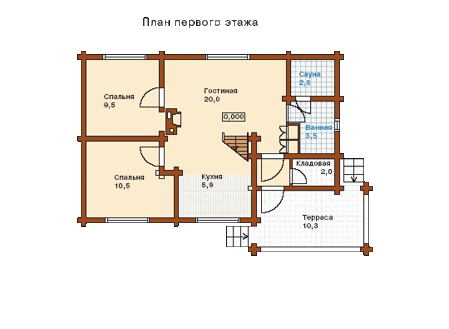 Большая гостиная с камином совмещена с помещением кухни и составляет с ней гармоничное единое пространство и создает ощущение большей свободы, чем есть на самом деле. Тут же на этаже запроектированы две спальни 9,5 кв. м. и 10,5 кв. м. Кроме того, для максимального комфорта и полноценного отдыха на первом этаже предусмотрено наличие небольшой сауны вход в которую осуществляется из ванной комнаты.