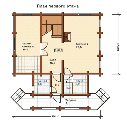 Проект комфортабельного деревянного особняка площадью 141,1 кв. м. хорошо подойдет для постройки дома для постоянного проживания, о чем говорит наличие в проекте всех необходимых для этого помещений. При этом внешний облик и экономичность данного проекта при воплощении позволяют использовать этот особняк и для периодического пребывания на сезонный отдых или уик-энд. Планировка является довольно традиционной и включает в себя просторные комфортабельные жилые помещения. Так, на первом этаже расположена просторная гостиная площадью 27,5 кв. м., оснащенная домашним камином. Напротив, через холл, находится кухня-столовая размером 19,2 кв. м. Так же первый этаж включает в себя небольшую сауну, вход в которую оборудован из помещения санузла.