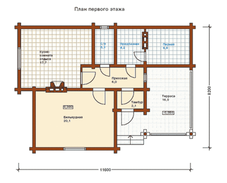 Комната, изначально запроектированная как бильярдная, вполне может быть переоборудована под гостевую комнату, спальню или просторную гостиную. Комната для отдыха совмещена с кухней и составляет с ней единое пространство на территории в 17,7 кв. м. Из объединяющей все помещения дома прихожей можно попасть в предбанник и далее в парилку.
