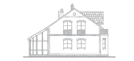 Загородный двухуровневый особняк с несложной двускатной кровлей. Индивидуальный характер фасадом особняка сформирован глубоким шестигранным эркером, расположенном по центральной оси слева от парадного входа. Экстерьер выгодно отличается от современной коттеджной застройки оригинальной облицовкой кирпичом и красивым природным камнем. Входной блок состоит из прихожей, лестницы, маленького гостевого санузла и техпомещения, а оставшаяся часть первого этажа представляет собой открытую территорию.