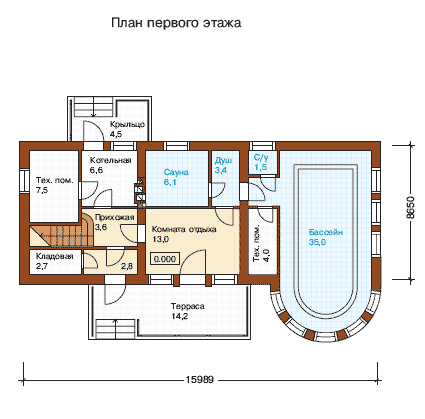 Респектабельный загородный особняк, изначально представляющий собой коттедж для отдыха. Проект предлагает общую площадь 136,9 кв. м. Этот дом отлично подойдет для сезонного отдыха большой дружной компанией и станет излюбленным местом каждого члена семьи. Первый этаж представляет собой полный набор необходимых для качественного отдыха помещений. Во-первых, это бассейн, размещенный на территории 35 кв. м. Рядом с ним находится небольшой санузел, душевая и далее более просторная сауна. Все эти помещения имеют выход в общую комнату для отдыха, а из нее оборудован отдельный выход на просторную придомовую террасу. В левой части здания на первом этаже компактно располагаются все технические помещения такие, как котельная, кладовая и помещение под технические нужды.
