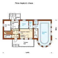 Важно, что данный проект может быть перестроен под двухэтажный коттедж для постоянного проживания, где на первом этаже вместо бассейна прекрасно расположится гостиная комната, а вместо сауны – кухня.