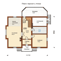 Проект предусматривает размещение гостиной и кухни-столовой на единой ничем не разделенной территории. Данная хитрость - любимый прием небольших проектов для достижения эффекта наибольшего пространства. Несмотря на ограниченную территорию в особняке предусмотрен рабочий кабинет, который в прочем всегда можно переоборудовать под абсолютно любые другие потребности.