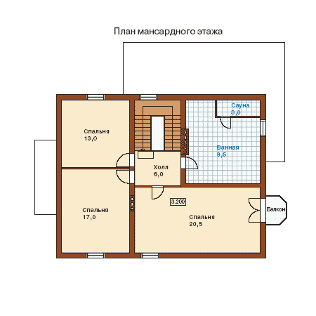Мансарда полностью отдана под территорию ночного хозяйского отдыха, где имеются три спальни и санузел с сауной. Одна из спален оснащена персональным выходом на небольшой балкон. Отсутствие в доме цоколя позволяет воплотить проект абсолютно на любом участке.