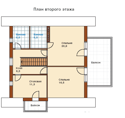 Большая веранда, размещенная сбоку дома имеет выход из просторной гостиной комнаты площадью 27,1 кв. м. Рядом с ней размещена кухня-столовая размером 11,6 кв.м. Тут же на этаже предусмотрена котельная, кладовая и небольшой санузел. Все три спальни второго этажа оборудованы выходами на балкон.