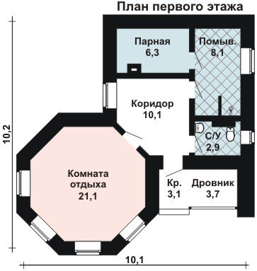 Небольшой коттедж из газобетона в стиле современного шале площадью 55,4 кв. м. станет прекрасным местом для отдыха на природе дружной компании или небольшой семьи. В этом доме есть все, что необходимо для приятного времяпровождения с максимальным комфортом, а внешний дизайн особняка приятен глазу и выглядит достаточно гостеприимно. У входа в дом расположен небольшой крытый дровник размером 3,7 кв. м. Войдя в особняк можно попасть в широкий просторный коридор площадью 10,1 кв. м., который ведет во все помещения, предусмотренные планировкой. Справа находится отдельный маленький санузел размером 2,9 кв. м. Далее расположена помывочная, из которой оборудован вход в парную. Размер парной составляет 6,3 кв. м., чего вполне достаточно для комфортного отдыха средней компании.
