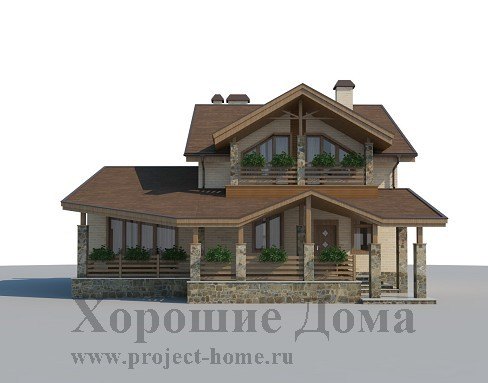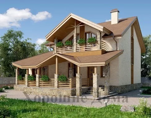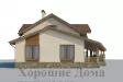 Уникальный по своему внешнему оформлению проект современного коттеджа во многом обязан своей диковинностью необычной крыше, являющейся одновременно навесом для просторной террасы перед домом. Ее форма привносит особую изюминку, привлекая внимание прохожих. Дом имеет площадь в 213,9 кв. м. и прекрасно подходит для проживания большой семьи, привыкшей к современным удобствам. Терраса у парадного входа занимает площадь в 44,6 кв. м., что позволяет организовать на ней собственное домашнее кафе для семьи и друзей.