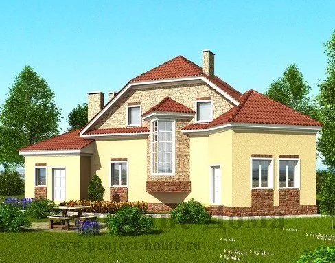 Проект двухэтажного дома с вальмовой крышей и эркерами