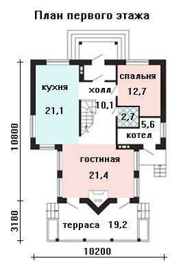 В особняке по проекту запланирована комфортабельная терраса размером 19,2 кв. м., открывающая обширные возможности для использования, например, для барбекю или вечеринок с друзьями на свежем воздухе. Выход на террасу осуществляется из гостиной комнаты площадью 21,4 кв. м. С левой стороны она объединена с большой кухней размером 21, кв. м. По правой стороне от гостиной находится небольшая котельная, санузел, а так же комната для размещения гостей.