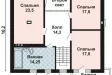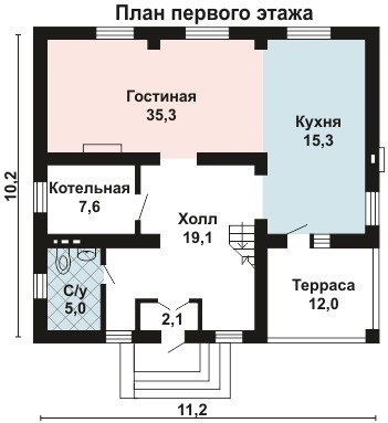 Слева от входа размещен гостевой санузел, а за ним помещение котельной. Гостиная комната занимает пространство в 35,3 кв. м. и совершенно не отделена от территории кухни, площадь которой так же довольно велика и составляет 15,3 кв. м. Из кухни имеется выход на террасу, а оттуда на придомовую территорию. Размеры террасы в 12 кв. м. вполне позволяют разместиться на ней всей семье для совместного отдыха, например, барбекю.