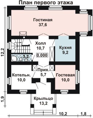 Планировка внутреннего пространства особняка выполнена очень логично и рационально. Большую часть первого этажа занимает гостиная с камином, эркером и высокими витражными окнами, наполняющими помещение солнечным светом. Кроме гостиной на первом этаже разместилась кухня, котельная и санузел.