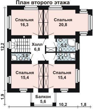 Из просторного холла лестница ведёт нас на второй этаж, который поделен на четыре спальни и три санузла. Две смежные спальни имеют выход на один балкон, одна из спален расположена в эркере, что делает её удивительно уютной и необычной по планировке комнатой.