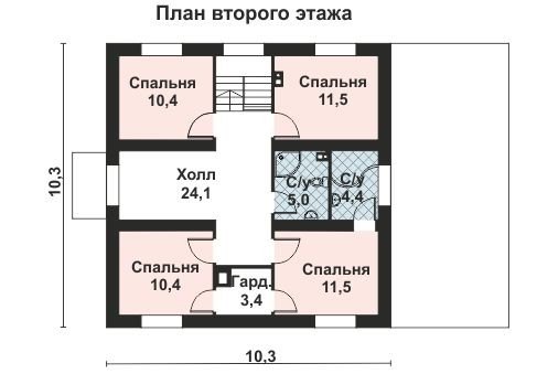 На первом этаже запланировано размещение двух спален и просторной гостиной, совмещенной с территорией кухни. Второй этаж так же имеет четыре спальни, что, впрочем, дает возможность организовать эти комнаты для любых других целей на усмотрение хозяев.