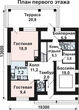 Зона отдыха занимает вторую половину этажа, там расположен бассейн, баня с душевой и комнатой отдыха, а также помещение бойлерной.