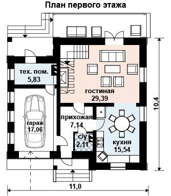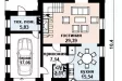 Главный вход в дом и въезд в гараж находятся под нависающим объёмом второго этажа, опирающегося на колонну. Кроме гаража для одной автомашины и смежного с ним помещения котельной, имеющего отдельный вход, на первом этаже дома разместилась зона приемы гостей, представленная большой кухней-столовой и просторной и светлой гостиной, попасть в которые можно из небольшого уютного холла. Гостиную и кухню разделяет небольшой арочный проём. В гостиной расположен камин и имеется выход на открытую летнюю террасу.