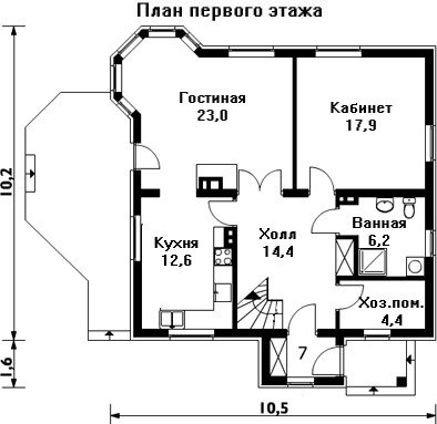 Планировка первого этажа очень удачна, все помещения имеют свое логичное расположение. Слева от просторного холла находится кухня, совмещенная со столовой. В гостиную можно попасть как из холла, так и из кухни. Гостиная большая, светлая, украшена пятигранным эркером и камином, из неё имеется выход на крытую террасу. Также на первом этаже имеется помещение для кабинета или гостевой спальни.