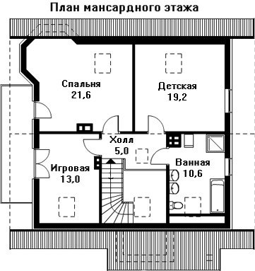 На мансардном этаже находятся две спальни и игровая комната, которая при необходимости может быть переоборудована в ещё одну спальню. Игровая комната и смежная с ней спальня имеют выходы на балкон. Кроме спален на этаже находится большая ванная комната с полным комплектом сантехники.