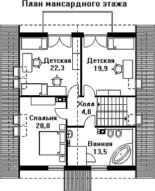 На мансардном этаже спланирована зона отдыха, там находятся три спальни, две смежные имеют выход на общий балкон. Также на этаже предусмотрена просторная ванная комната с джакузи.