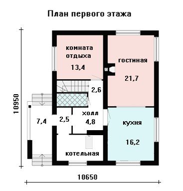 На первом этаже справа от главного входа разместилась вместительная котельная, которая может служить одновременно и прачечной. Далее следует небольшой холл. Планировка очень рациональна, потому площади помещений, не несущих смысловой нагрузки, невелики.