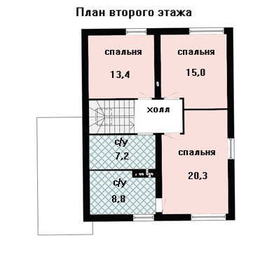 Второй этаж, мансардный, представляет собой три разновеликие спальни. Самая большая спальня оборудована персональной ванной комнатой. Кроме того на этаже разместились холл и ванная комната для общего пользования.
