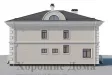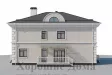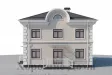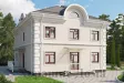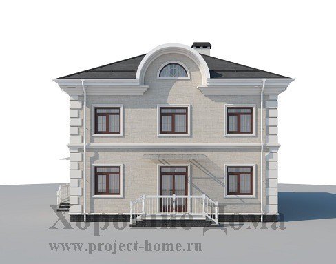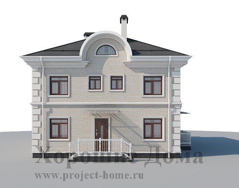Спокойный стильный загородный коттедж для небольшой семьи из 2-4 человек. Фасад дома строгий, симметричный, в отделке минимум декора, только русты по углам здания и небольшие карнизы по периметру. Элегантный круглый фронтон, ажурные белоснежные перила в оформлении крыльца и небольшой крытой террасы с левой стороны здания.