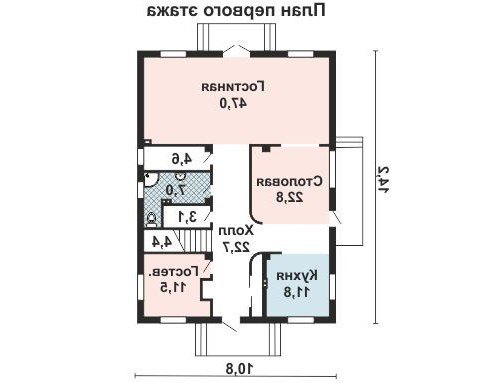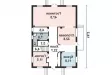 Планировочное решение очень логично и рационально. В доме есть весь необходимый минимум помещений для комфортного проживания. Просторный холл проходит по центру помещения первого этажа и упирается во внушительных размеров гостиную с выходом на террасу. По одну сторону холла устроены помещения кухни-столовой, по другую – гостевая спальня, санузел, котельная, кладовая.