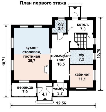 Вход в дом - через небольшой тамбур, слева от входа находится веранда, выполненная в виде пристройки к основному объёму здания. Первый этаж полностью выделен под зону дневного пребывания и хозяйственный блок. Гостиная, кухня и столовая объединены в единое пространство и занимают половину площади первого этажа. Помещение украшено большим камином. В противоположной половине разместились кабинет, санузел, ванная комната и котельная. Из просторного холла на второй этаж ведёт широкая лестница.