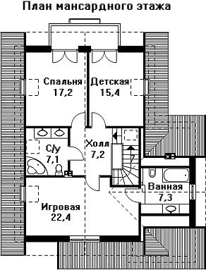 На втором этаже, мансардном, расположены две спальни, имеющие выход на общий балкон, большая игровая комната общего пользования, санузел и просторная ванная комната.