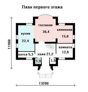 Планировка первого этажа выполнена с учётом современных тенденций, все помещения просторные и светлые. Вместительная гостиная комната, каминный зал и кухня-столовая представляют собой единое пространство. Настоящим украшением гостиной является остеклённый эркер, из которого открывается прекрасный вид в сад. К прихожей на первом этаже примыкают котельная, санузел, небольшой гардероб и бытовая комната, которая может быть использована как прачечная и/или кладовая.