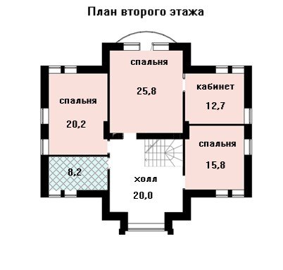 На второй этаж ведет двухмаршевая лестница, на нем расположены три спальни, большой холл и санузел. Спальня хозяев дома соседствует с кабинетом и имеет выход на уютный балкончик.