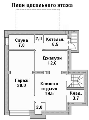 Цокольный этаж удивительно функционален, на нём размещаются помещения с различной смысловой нагрузкой: встроенный гараж, котельная, кладовая, а также сауна, минибассейн-джакузи, комната отдыха. Котельная оборудована отдельным выходом на участок.