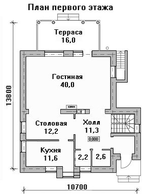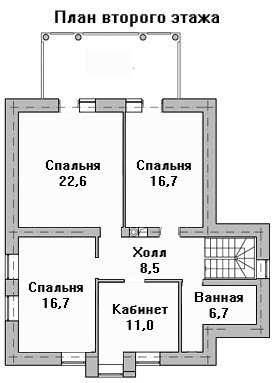 Лестница для экономии полезной площади вынесена в эркер, по ней можно подняться на второй этаж особняка, где находится зона отдыха и ночного пребывания, включающая в себя три спальни, кабинет, ванную комнату.