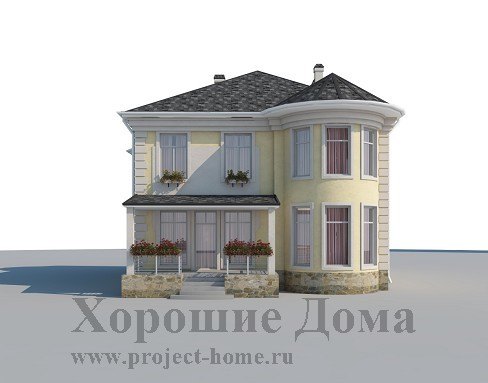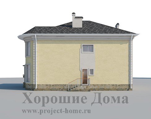 Особое внимание привлекает помещение лестничного марша, которое украшает собой не только внутренний интерьер, но и придаёт особую изюминку фасаду дома. Также украшением фасада является элегантный фронтон и карниз.
