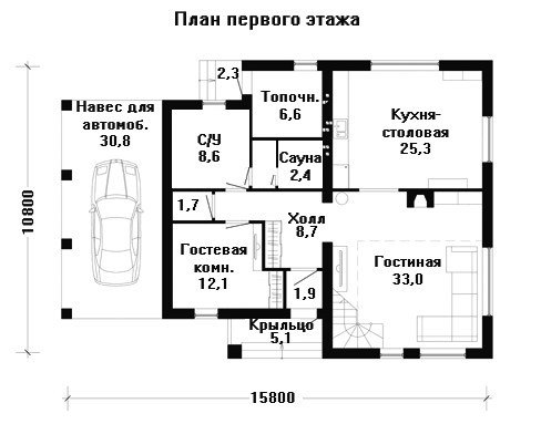 Практичная и хорошо продуманная планировка делает проживание в особняке максимально комфортным. Несмотря на отсутствие гаражного помещения около дома оборудован навес для размещения семейного авто размером 30,8 кв. м. В дом можно попасть через небольшое крытое крыльцо, которое ведет в небольшой тамбур, а затем в широкий холл. Необычным решением стало размещение лестницы на второй этаж в углу главной комнаты в доме – гостиной, площадь которой составляет 33 кв. м. Из гостиной можно попасть в просторную комнату кухни-столовой размером 25,3 кв. м.