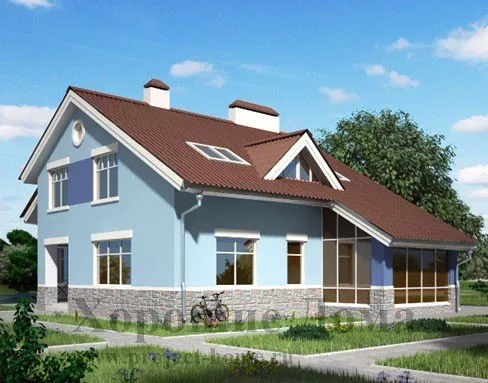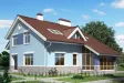 Проект просторного семейного дома площадью 215,3 кв. м. Дом имеет вместительный мансардный этаж, что позволяет в нём разместиться довольно большой семье или гостям. Самым просторным помещением в доме является гостиная комната на первом этаже. Её площадь составляет 34,6 кв. м. В гостиную ведёт холл площадью 13,4 кв. м., где расположена лестница на второй этаж. Также к гостиной комнате примыкает кухня-столовая 24,2 кв. м., которая ведёт на большую веранду (11,8 кв. м.) с выходом на придомовую территорию.
