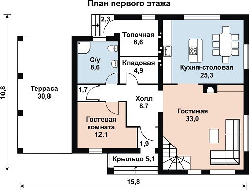 Планировка особняка тщательно продумана, а каждый метр использован с умом. Первый этаж помимо жилых помещений включает в себя топочную и кладовую, что полностью компенсирует отсутствие цокольного этажа с помещениями технического назначения. Все жилые комнаты первого этажа довольно просторные, так, например, гостиная с камином занимает территорию в 33 кв. м., а кухня-столовая – 25,3 кв. м. Санузел первого этажа так же довольно большой, его площадь составляет 8,6 кв. м. Слева от него предусмотрена комната для размещения гостей.