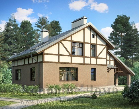 Проект дома из газобетона в чешском стиле с навесом для авто