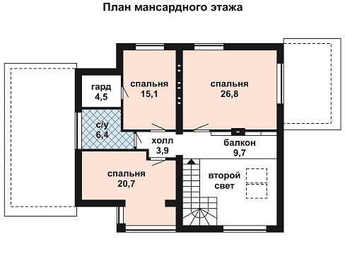 На мансардном этаже по проекту предусмотрены три спальни, очень светлые и просторные, а также ванная комната и гардероб.