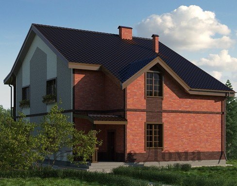 Теплый дизайн этого проекта говорит о гостеприимстве и уютной атмосфере в выбравшей его семье. Дом, построенный из газобетона, занимает площадь в 253,8 кв. м. и имеет два этажа. На первом этаже коттеджа по проекту размещена кухня размером 13,5 кв. м., плавно переходящая в гостиную комнату с домашним камином, площадь которой составляет 22,5 кв. м. Из просторного холла так же можно попасть в просторную гостевую комнату, топочную и санузел первого этажа.
