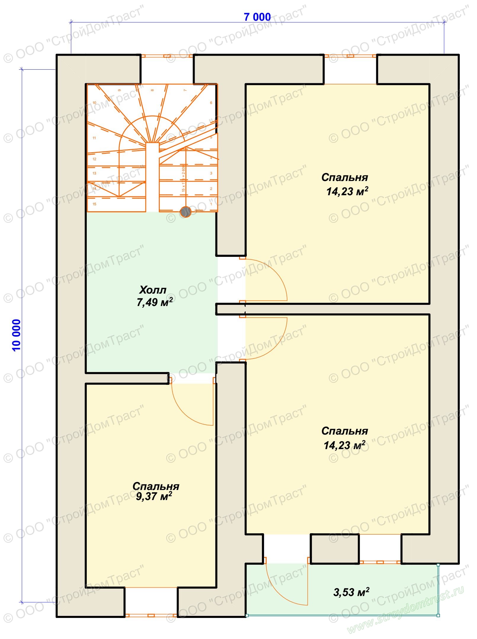 На втором этаж три спальни: две больших (14,2 кв.м) и одна поменьше (9,3 кв.м). Одна из спален имеет выход на балкон (3,5 кв.м). Все комнаты соединяет удобный холл (7,5 кв.м).