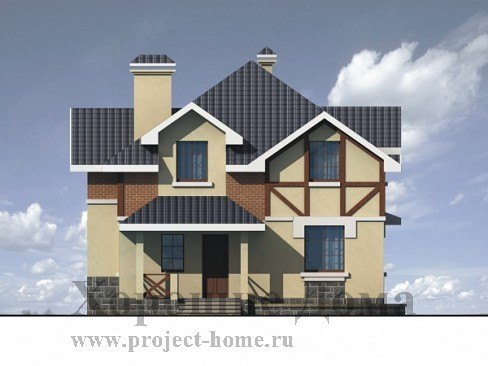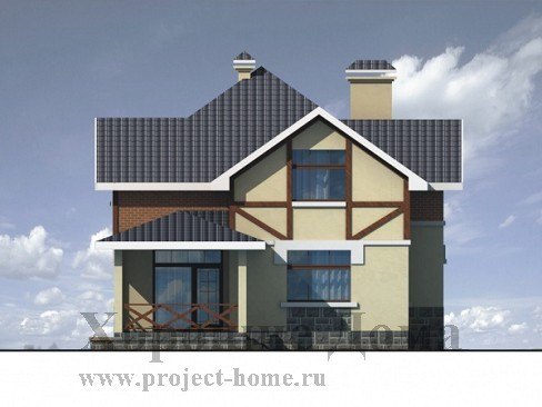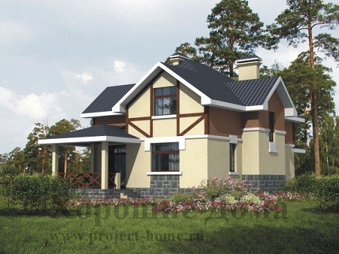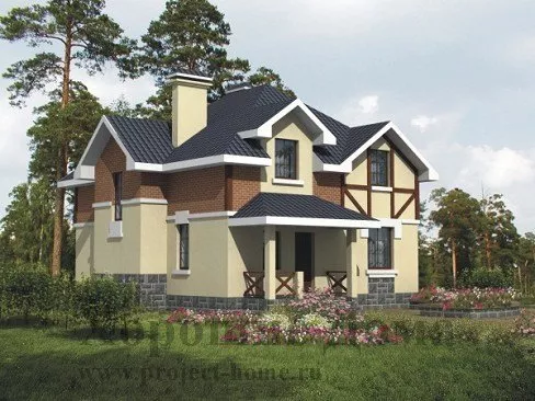 Добротный загородный коттедж предназначен для проживания небольшой семьи в составе 2-4 человека в теплое время года. Дом выделяется оригинальным решением многоскатной крыши, большими светлыми окнами, элегантным решением в оформлении фасада. Главный вход в дом оформлен навесом на колоннах, такие же колонны поддерживают крышу уютной террасы.