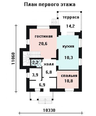 Планировка дома очень проста, площади распланированы логично и рационально. На первом этаже находится большая кухня с выходом на террасу. Помещение гостиной отделено от кухни арочным проемом, и может быть использовано также как столовая. Кроме того на первом этаже размещается гостевая спальня, санузел и гардероб или небольшая хозяйственная комната.