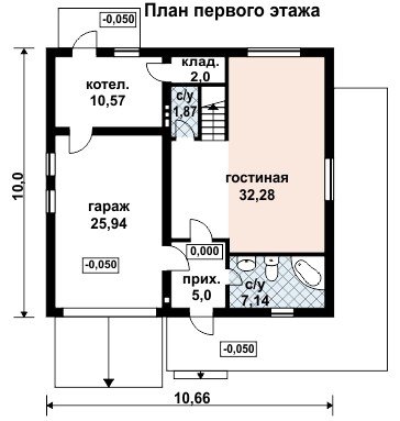 На первом этаже дома разместился гараж на одну автомашину, санузлы, помещения хозяйственно- бытового назначения. Вся остальная площадь, именуемая на плане гостиной, может быть распланирована по желанию заказчика с зонированием на кухню, столовую и собственно гостиную.
