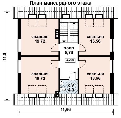 На мансардном этаже - место для спален и санузла. На этаже разместились четыре спальни, каждые две смежные спальни имеют одинаковую площадь. Площадь комнат позволяет оборудовать в каждой по желанию заказчика персональные гардеробные комнаты.