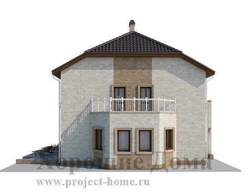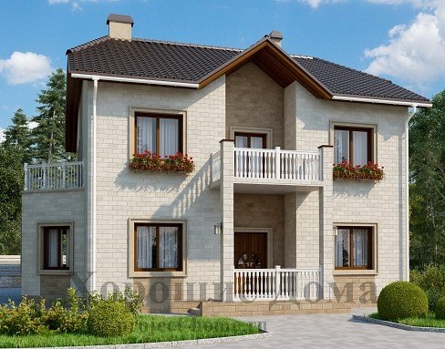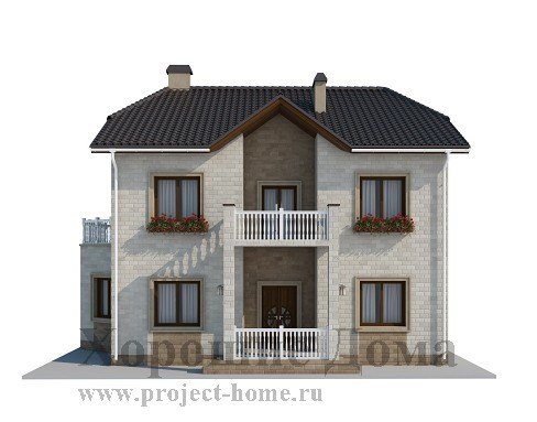 Отлично продуманный проект дома для большой семьи подойдет для проживания или для создания небольшого гостевого дома. Планировка дома тщательно спроектирована под максимально комфортное размещение его жителей. Внешний облик притягивает взгляд приятным глазу оформлением, а наличие эркера на первом этаже делает проект еще более занимательным.