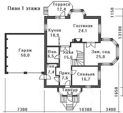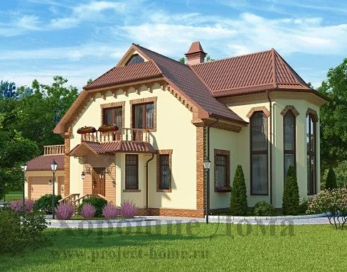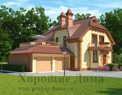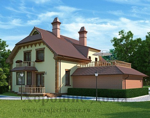 С левой стороны к дому приблокирован гараж для одной автомашины, плоская крыша которого служит просторной открытой террасой с деревянной балюстрадой. Вход в дом организован через тамбур-эркер, за которым следует небольшой холл.